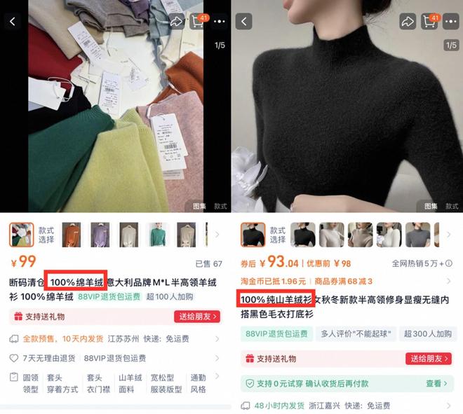 直播间标价39.9元、99元的“羊绒衫”99%是假货!不管他是以什么“福利回馈”、“反季节促销”、“尾单”还是各种其他名义,过度的便宜就是大有问题。