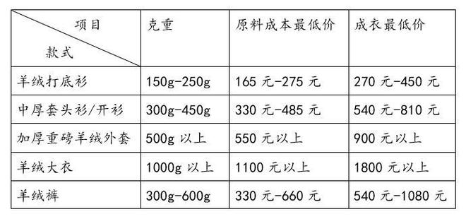 现在的羊绒价格加上损耗差不多1.1元/克,好一些的纱线克的羊绒衫光原料的成本价最低都是330块。再加上加工费、运输,宣传,设计,开发等等,算下来最起码也要1.8/克,好的要差不多2.5元/克,所以一件300克的羊绒衫这时候已经540-750块了。
