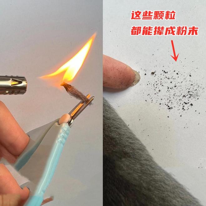 但是!这个方法并不能检测是不是纯羊绒,因为如果里面掺杂了羊毛、兔毛这些动物毛烧起来是和羊绒一样的,所以只能做辅助鉴别,还需要搭配别的测试方法一起看。